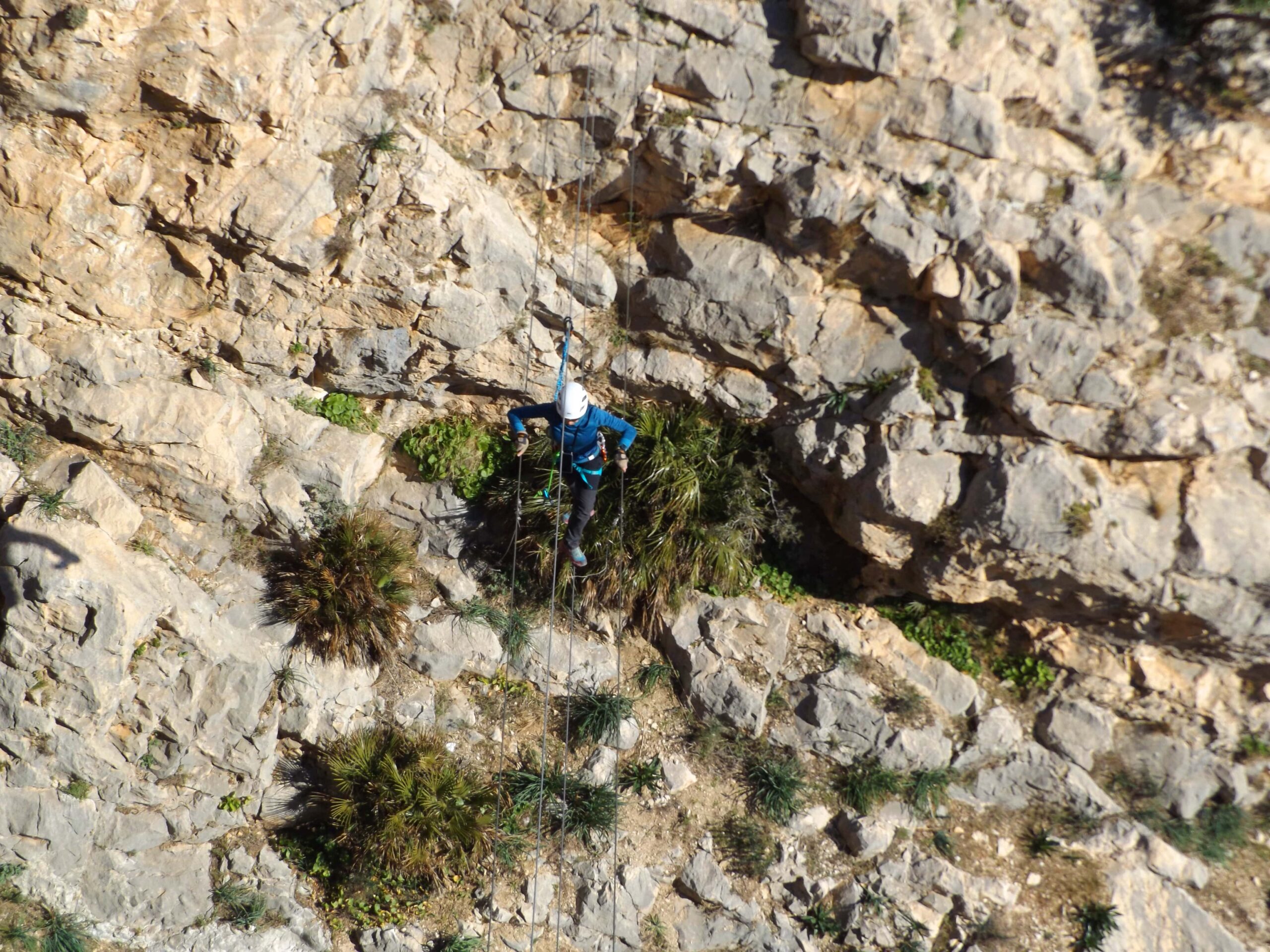 👉 TRAMO 1: 150 metros de Altitud. Desde el INICIO hasta la TIROLINA. Este es un tramo más duro para los nóveles y lo podremos considerar excluyente ya que si el deportista no es capaz de subir, todavía se puede bajar. En este tramo se encuentra el extraplomo más duro de la vía, pasando éste solo nos quedará disfrutar de recorrido sin la exigencia inicial. Ascenderemos por una canal con cuidado de no arrastrar piedras y llegaremos a la pared derecha progresando en ascenso con descansos en repisas hasta el paso de la TIROLINA.